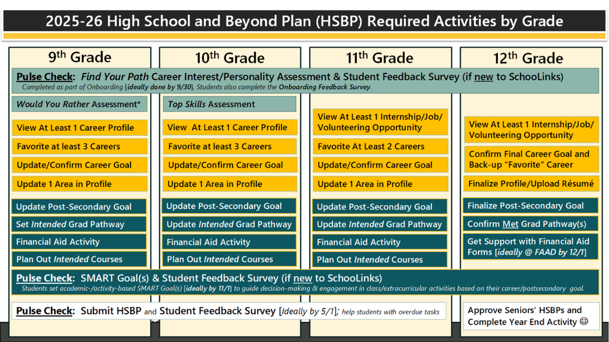 HSBP completion is verified in 12th grade. Students are marked as “Met” only after they submit all requirements during their senior year and those items are approved by school staff. This includes our current 11th graders, who will have additional activities to complete this year and next. Please note that this new requirement for HSBPs pertains to ALL current 11th-grade (As of the 2025/26) students, including those who previously had this requirement marked as “Met.”